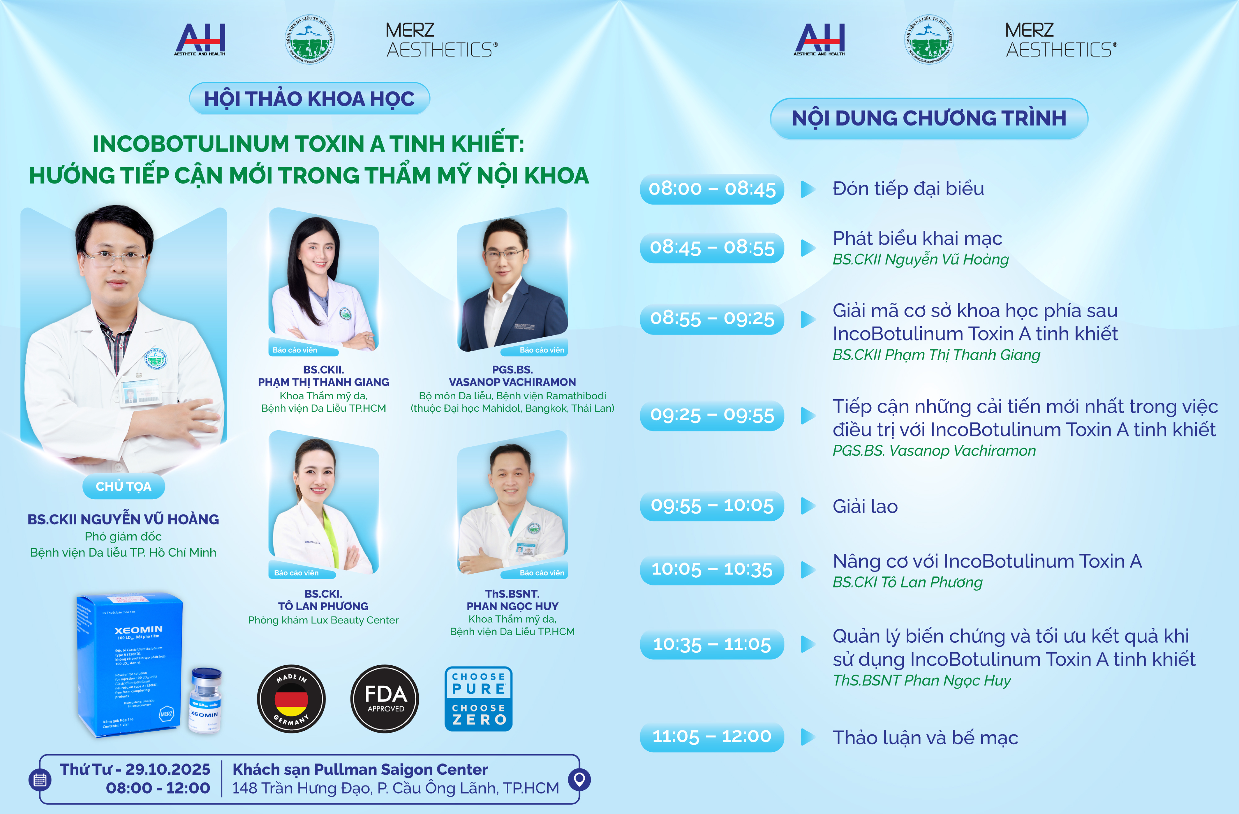 HÌNH THỨC: Trực tiếp tại Hội trường A, Bệnh viện Da Liễu TP. Hồ Chí Minh – 2 Nguyễn Thông, Phường Võ Thị Sáu, Quận 3, Thành phố Hồ Chí Minh