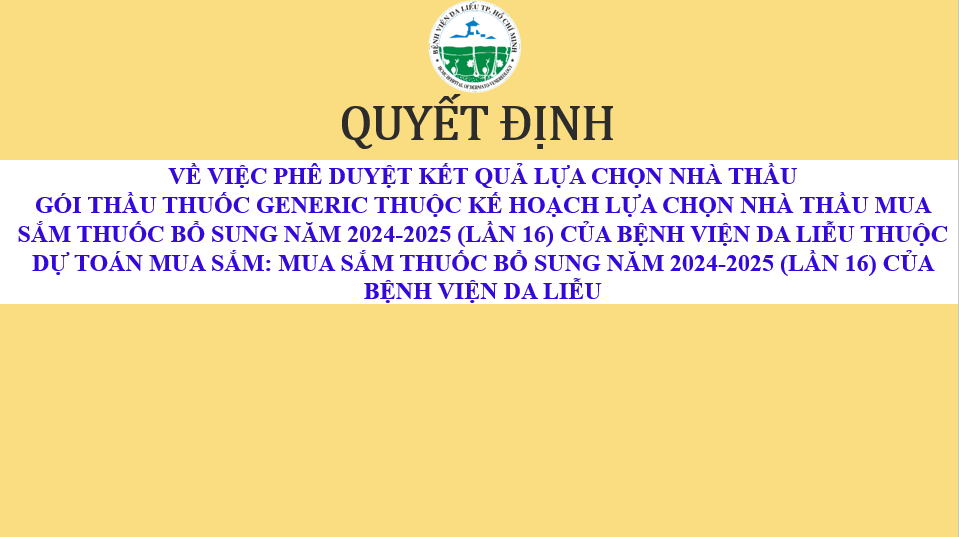 Quyết định số 448/QĐ-BVDL ngày 21/5/2025 về việc phê duyệt kết quả lựa chọn nhà thầu gói thầu thuốc dược liệu, thuốc có kết hợp dược chất với các dược liệu, thuốc cổ truyền thuộc kế hoạch lựa chọn nhà thầu cung cấp thuốc dự toán mua sắm thuốc năm 2024-2025 của Bệnh viện Da Liễu