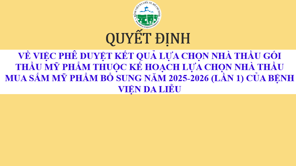 QUYẾT ĐỊNH VỀ VIỆC PHÊ DUYỆT KẾT QUẢ LỰA CHỌN NHÀ THẦU GÓI THẦU MỸ PHẨM THUỘC KẾ HOẠCH LỰA CHỌN NHÀ THẦU MUA SẮM MỸ PHẨM BỔ SUNG NĂM 2025-2026 (LẦN 1) CỦA BỆNH VIỆN DA LIỄU